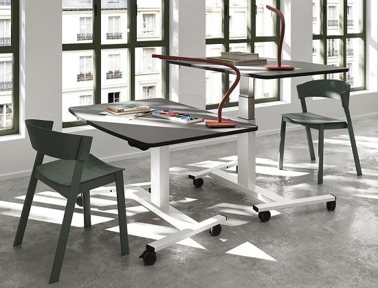 Die Tische Lista Office LO Cockpit lassen sich mit Hilfe eines Luftmotors zwischen 660 und 1320 mm in der Höhe verstellen. Die Tischplatten haben eine Abmessung von 1200 x 800 mm, wobei die Vorderseite leicht nach außen gewölbt ist.