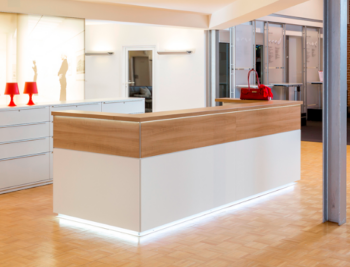 Les réceptions peuvent être configurées de façon linéaire, en L ou en U. Des bandes LED peuvent venir compléter votre réception en étant installées sous le socle et/ou le plateau de comptoir.
